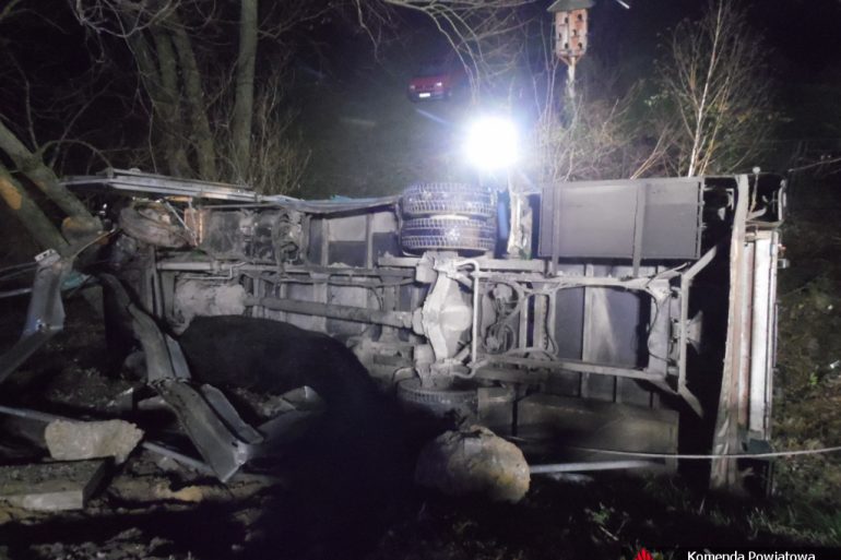 Po przybyciu na miejsce zdarzenia stwierdzono, że samochód ciężarowy przeznaczony do przewozu bydła przebił barierę i stoczył się z nasypu. Wewnątrz kabiny znajdował się kierowca, który nie był w stanie opuścić pojazdu o własnych siłach. Ratownicy z OSP Firleja i Kocka ewakuowali kierującego mężczyznę z kabiny pojazdu. Następnie poszkodowany został przewieziony przez Zespół Ratownictwa Medycznego do szpitala.