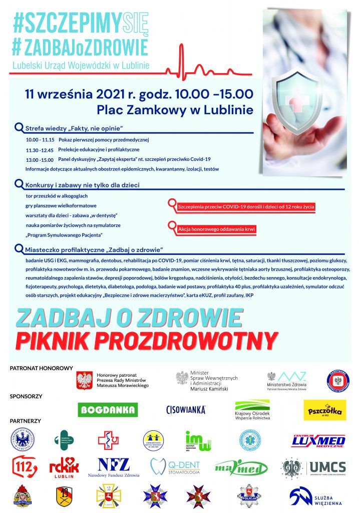 W Światowy Dzień Pierwszej Pomocy, w sobotę 11 września 2021 roku, w godz. 10.00-15.00 na Placu Zamkowym w Lublinie odbędzie się piknik prozdrowotny „Zadbaj o zdrowie” oraz akcja szczepień przeciw COVID-19. Inicjatywa podjęta przez wojewodę lubelskiego Lecha Sprawkę, ma na celu kształtowanie umiejętności podejmowania racjonalnych decyzji w zakresie ochrony zdrowia, zwłaszcza dotyczących profilaktyki prozdrowotnej oraz szczepień przeciwko COVID-19.
