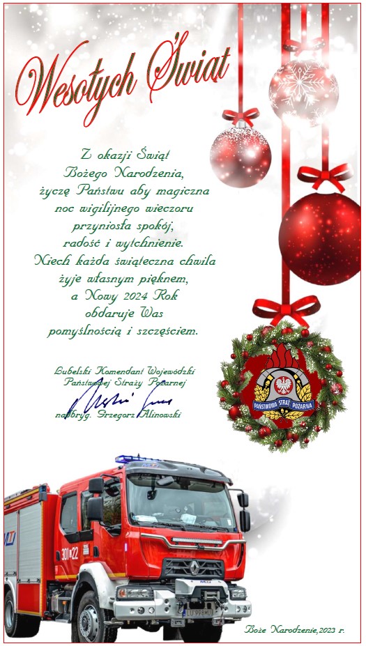 Aktualności, Ważny news, Wiadomości Życzenia Lubelskiego Komendanta Wojewódzkiego PSP z okazji Świąt Bożego Narodzenia i Nowego Roku 2023-12-22 Views: 656