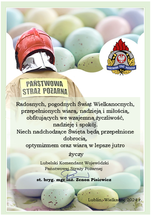 Aktualności, Ważny news, Wiadomości Życzenia Lubelskiego Komendanta Wojewódzkiego PSP z okazji Świąt Wielkanocnych 2024-03-29 Views: 424
