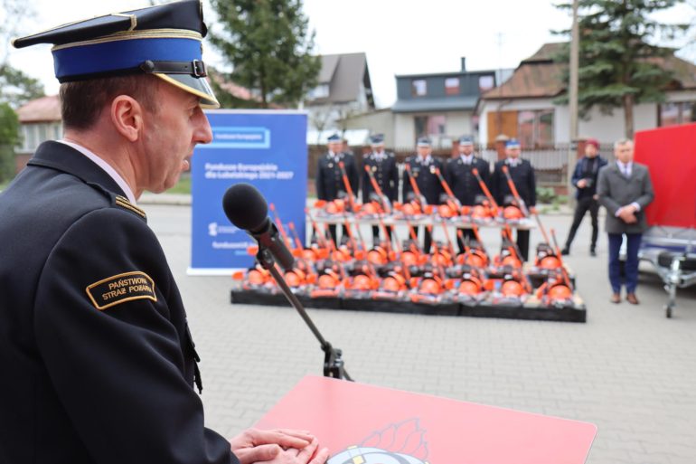 Projekt pn. „Dostosowanie Krajowego Systemu Ratowniczo-Gaśniczego na terenie województwa lubelskiego do zmian klimatycznych, zmian w środowisku naturalnym oraz zagrożeń cywilizacyjnych” – realizowany w ramach programu Fundusze Europejskie dla Lubelskiego 2021 – 2027 w ramach Priorytetu Środowiskowego – Ochrona zasobów środowiska i klimatu – pozwolił na zakup przez Komendę Wojewódzką Państwowej Straży Pożarnej w Lublinie – łącznie 173 sztuk zestawów pilarza (pilarki, przyłbice) oraz 24 sztuk przyczep z namiotem i wyposażeniem logistycznym dla jednostek OSP włączonych do Krajowego Systemu Ratowniczo – Gaśniczego z terenu województwa lubelskiego. Zakupiony sprzęt trafi do wszystkich powiatów na terenie województwa lubelskiego.
